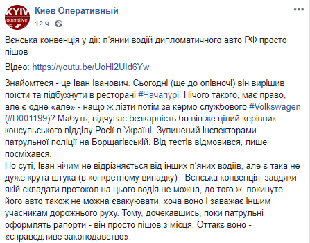 Как утверждают в сообществе, в ночь с 14 на 15 июня российский консул отдыхал в грузинском ресторане "Чачапури", где он употребил алкоголь, после чего сел за руль служебного Volkswagen с дипломатическим госномером D001199. Это заметила журналистка телеканала СТБ Елена Лунькова, которая поехала за ним и вызвала полицию. Он был остановлен инспекторами на улице Борщаговской. От медосвидетельствования мужчина отказался.