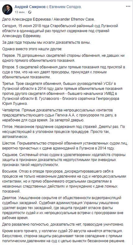 Старобельский районный суд Луганской области в одиннадцатый раз продлил содержание под стражей экс-главе фракции Партии регионов и бывшему губернатору Луганской области Александру Ефремову. Об этом на своей странице в Facebook сообщил адвокат Ефремова Андрей Смирнов.