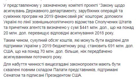 "Таким образом, совокупный объем средств, которые могут быть выделены для поддержки Украины в 2019 бюджетном году, составляет $691 млн, что более чем $70 млн больше, чем предусмотрено ассигнованиями текущего года", – сказано в сообщении.