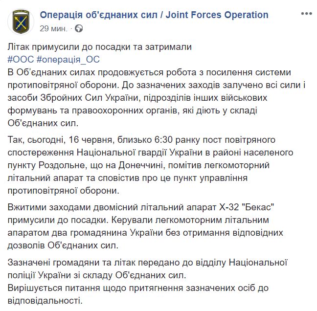 "16 июня, около 6:30 утра пост воздушного наблюдения Национальной гвардии Украины в районе населенного пункта Раздольное, что в Донецкой области, заметил легкомоторный летательный аппарат и сообщил об этом пункт управления противовоздушной обороны. Летательный аппарат Х-32 "Бекас" принудили к посадке. Руководили легкомоторным летательным аппаратом два гражданина Украины без получения соответствующих разрешений ОС", - говорится в сообщении.