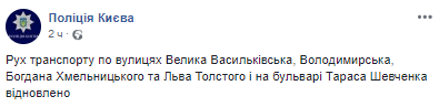 В Киеве, где в воскресенье прошел 20-минутный "Марша равенства", движение транспорта по улицам Большая Васильковская, Владимирская, Богдана Хмельницкого и Льва Толстого и на бульваре Тараса Шевченко было возобновлено после перекрытия.