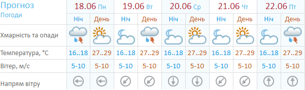 По данным сайта Sinoptik.ua, считает, что гроза будет в пятницу и субботу. Дневная температура +28...+29. В воскресенье столбик термометра днем опустится до +22.