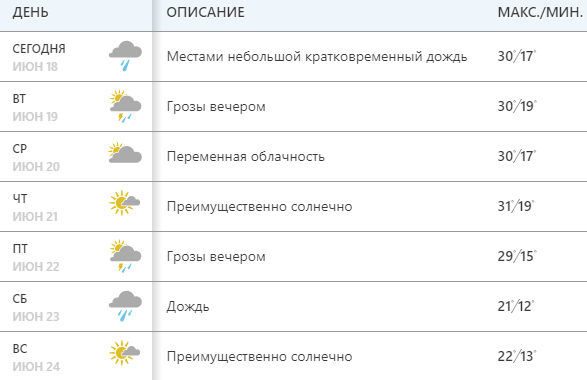 Сайт Weather.com сообщает, что дождь ожидается в понедельник, вторник, пятницу и субботу. Неделя начнется с жары до +29...+30. На выходных +21...+22.