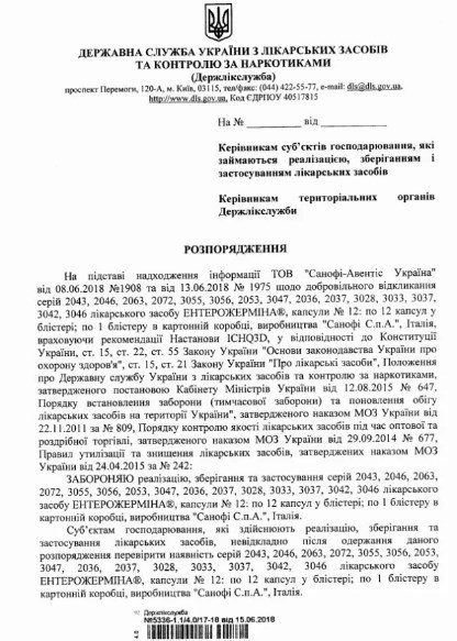 Запрет установили 15 июня на основании поступления информации ООО "Санофи-Авентис Украина" относительно добровольного отзыва серий 2043, 2046, 2063, 2072, 3055, 3056, 2053, 3047, 2036, 2037, 3028, 3033, 3037, 3042, 3046.