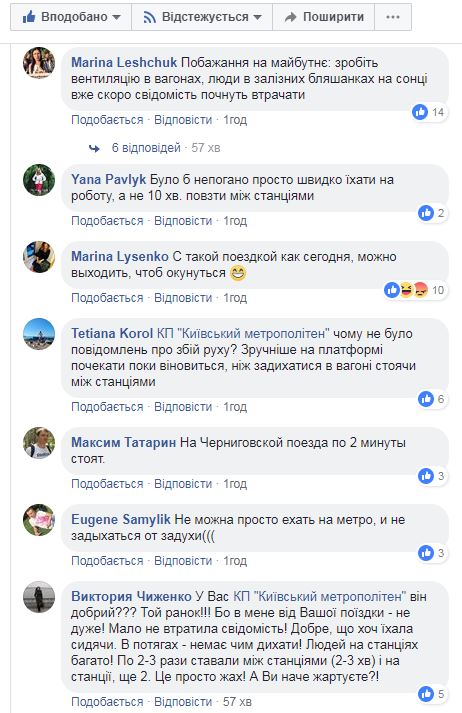 "Сегодняшняя поездка с 8:30 от "Дарницы" до "Днепра" была самой экстремальной в моей жизни - это просто ад какой-то, напомнило поездку в 80-е на поезде Киев-Кисловодск в 35-градусную жару в плацкарте без кондиционера. Что это было???" - написал Петр Черных.