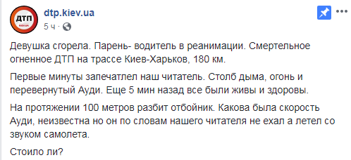 В понедельник, 19 июня на 180-м километре трассы Киев-Харьков "летевшая" на большой скорости легковая машина Audi врезалась в отбойник и загорелась.