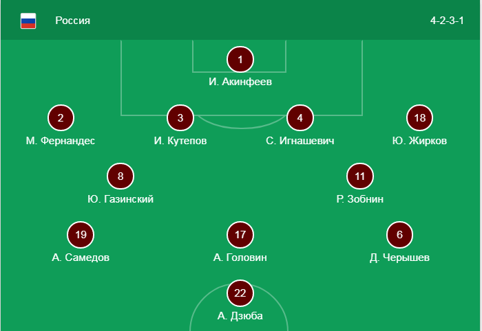 Россия: Акинфеев - защита Фернандес, Игнашевич, Кутепов, Жирков - полузащита Газинский, Зобнин Самедов, Головин, Черышев - нападение Дзюба