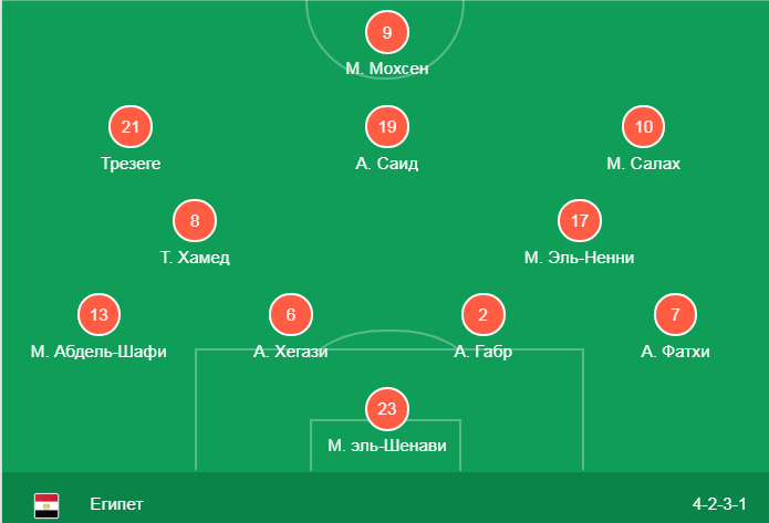 Египет: Эль-Шенави - защита Фатхи, Хегази, Габр, Абдель-Шафи - полузащита Эльнени, Хамед, Салах, Эль Саид, Трезеге - нападение Мохсен