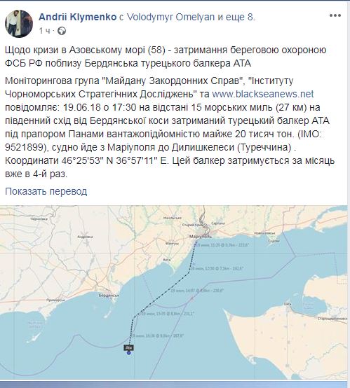 "Мониторинговая группа "Майдана иностранных дел", "Института Черноморских Стратегических Исследований" и www.blackseanews.net сообщает: 19.06.18 в 17:30 на расстоянии 15 морских миль (27 км) к юго-востоку от Бердянской косы задержан турецкий балкер ATA под флагом господами грузоподъемностью почти 20 000 тонн. (IMO: 9521899), судно идет из Мариуполя в Дилишкелесы (Турция). Координаты 46°25'53" N 36°57'11" E. Этот балкер задерживается за месяц уже в 4-й раз", - написал журналист.