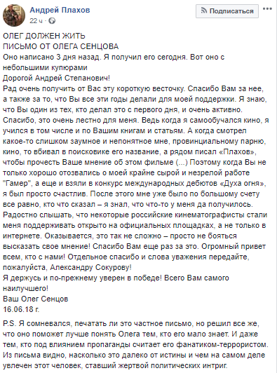 Российский кинодокументалист Андрей Плахов опубликовал письмо заключенного украинского режиссера Олега Сенцова.