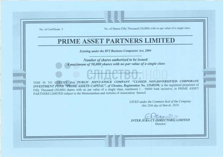 "Кипрские юристы решили увеличить общее количество акций в Prime Asset Partners с 1000 до 50 000. До этого компания имела лишь 1000 акций и одного акционера – Петра Порошенко. Документами от 25 марта 2016 года юристы увеличили количество акций и передали все акции Порошенко в украинский фонд "Прайм эссетс кэпитал", напрямую связанный с Петром Порошенко", - отмечают журналисты-расследователи.