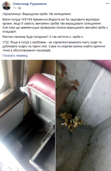 "Если бы вместо обычных грибов там выращивали галюцигенные, то вагон поезда 143\144 "Кременчуг-Ворохта" мог бы заинтересовать соответствующие органы", - написал Александр Рудоманов и добавил, что грибы могут выручить проголодавшегося в дороге пассажира.