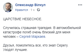 "Случилась страшная трагедия. В автомобильной катастрофе погиб очень близкий для меня человек – Сергей Маркаев. Друзья, помолитесь все, кто знал Серегу. Уходят лучшие", - рассказал Вилкул.