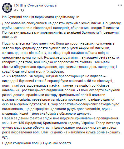 "Как выяснилось, интуиция правоохранителей не подвела - похищенные пчелиные домики были спрятаны в той же лесополосе, рядом с которой располагалась пасека. И пока эксперты изымали вещественные доказательства, работники сектора криминальной полиции опросили возможных свидетелей, проверили по месту жительства ранее судимых лиц и местных пчеловодов. В ходе оперативно-розыскных мероприятий было установлено, что к краже "приложили руку" двое мужчин, один - местный, другой - его знакомый из областного центра", - об этом сообщил начальник Тростянецкого отделения полиции Игорь Кисилев.