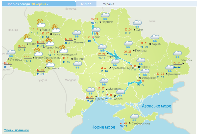 В субботу, 30 июня, почти по всей территории Украины пройдут дожди. Об этом сообщает Укргидрометцентр.