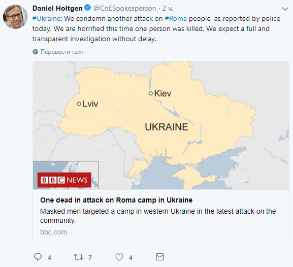 Совет Европы осудил нападение на лагерь ромов во Львове, в результате которого убили 24-летнего парня, международная организация требует прозрачного и быстрого расследования инцидента.
