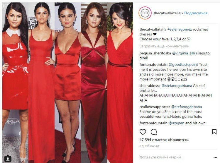 Так, в аккаунте The Catwalk Italia, где публикуются фотографии лучших нарядов знаменитостей, появился коллаж из пяти снимков Селены Гомес в красных платьях. Пользователям соцсети было предложено выбрать лучшее из них.
