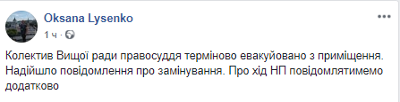 "Коллектив Высшего совета правосудия срочно эвакуирован из помещения. Поступило сообщение о заминировании. О ходе чрезвычайного происшествия сообщим дополнительно", - написала она.