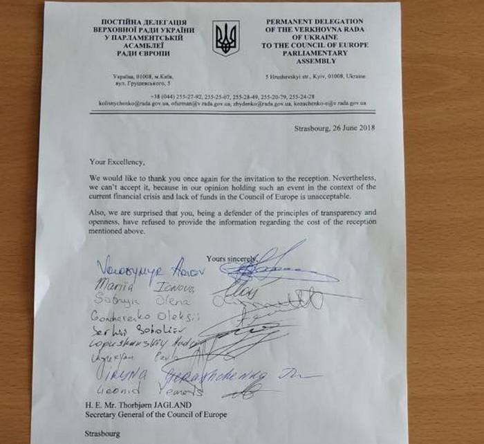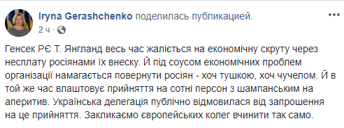 "Генсек СЕ Т.Янгланд все время жалуется на экономические трудности из-за неуплаты россиянами их взноса. И под соусом экономических проблем организации пытается вернуть россиян - хоть тушкой, хоть чучелом. И в то же время устраивает приемы на сотни персон с шампанским на аперитив. Украинская делегация публично отказалась от приглашения на этот прием. Призываем европейских коллег поступить так же", - заявила она в Facebook.