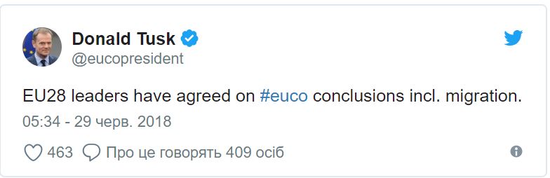 Главы стран Евросоюза в ночь на 29 июня достигли соглашения по миграционной политике в ходе саммита ЕС в Брюсселе после почти 15-часовых переговоров. Об этом сообщает BBC News.
