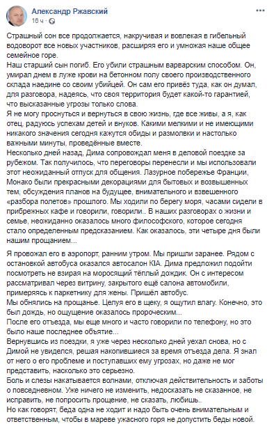 "Наш старший сын погиб. Его убили страшным варварским способом. Он, умирал днем в луже крови на бетонном полу своего производственного склада наедине со своим убийцей. Он сам его привез туда, как он думал, для разговора, надеясь, что своя территория будет какой-то гарантией, что высказанные угрозы только слова", - пишет в соцсети политик.