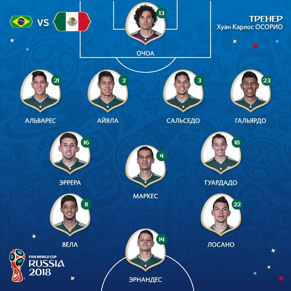 16.00 Стартовые составы. Как видим, Мексика внезапно с первых минут вывела капитана команды Рафаэля Маркеса. Видимо со старта бросают на Бразилию лучшие силы, чтобы устроить футбольный блицкриг.