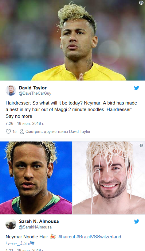 14.30 Сборная Бразилии вчера провела тренировку на поляне "Самара Арены". Слава Богу Неймар избавился от ужасной прически, которая шокировала миллионы болельщиков. Этот шедевр в соцсетях обозвали "птичьим гнездом из лапши".