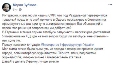 "В Одессе пассажиров с билетами на промежуточные станции тупо выкинули из поездов без объяснений и вариантов решения вопроса как им добраться? В Германии в таком случае автобусы запускают и пассажиров доставляют. Я позвонила на ЖД, где на мой вопрос будут ли автобусы мне ответили - нет, конечно", - написала в Facebook Мария Зубкова.