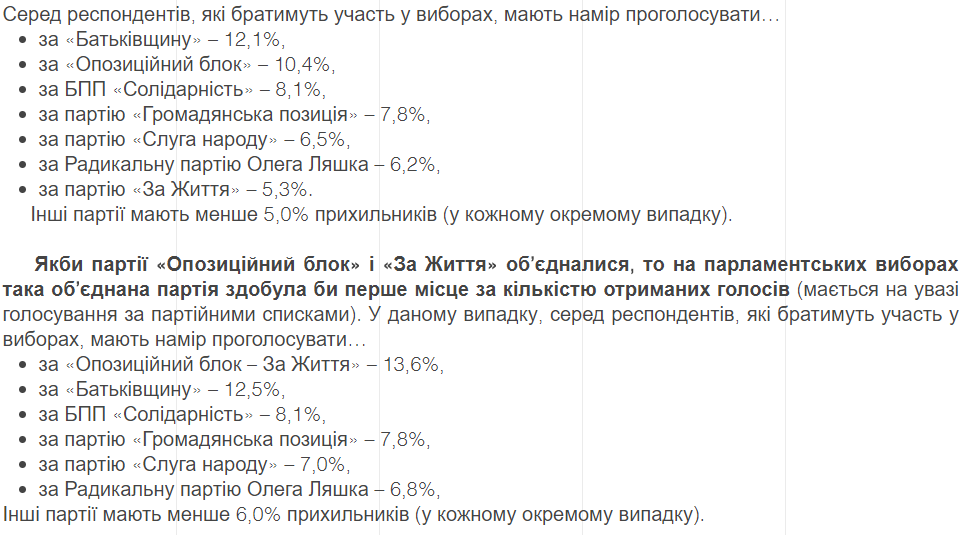 В случае, если бы партии "Оппозиционный блок" и "За життя" объединились, то союз набрал бы 13,6%.