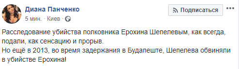 "Расследование убийства полковника Ерохина Шепелевым, как всегда, подали, как сенсацию и прорыв. Но ещё в 2013, во время задержания в Будапеште, Шепелева обвиняли в убийстве Ерохина", - пишет Панченко.