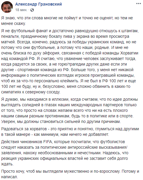 "У футболиста, который много лет защищал честь киевского Динамо и жил в столице Украины в очень тяжелое для нашей страны время, осталось здесь много друзей и болельщиков, заслуживших, чтобы частичку этой победы он посвятил именно им! За последние несколько лет обращение "Слава Украине!" стало для наших граждан символом несгибаемости и патриотизма! И вполне естественно, что человек, которому наша страна дала очень много, с большим уважением относится к ней, к ее гражданам. Он имеет право публично высказать уважение и к Украине, и к ее гражданам! Мы оперативно направили в соответствующие органы ФИФА и УЕФА письма с целью защитить не только футболиста хорватской сборной, но и, в первую очередь, человека, который имеет право на свою позицию и уважает нашу страну!!! И Вида сыграет в полуфинале ЧМ-2018! Слава Хорватии! Слава Украине!!!", - написал Павелко.