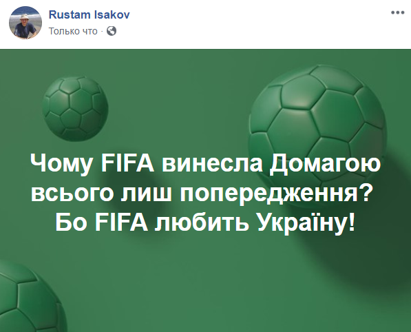 "Почему FIFA вынесла Домагою всего лишь предупреждение? Потому что FIFA любит Украину!", - то ли в шутку, то ли всерьез говорит блогер Рустем Исаков.