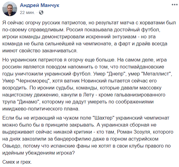 "Игра россиян является поводом напомнить о том, что постмайдановские годы уничтожили украинский футбол. Умер "Днепр", умер "Металлист", Умер "Черноморец", хотя ватник Новинский пытается сейчас его возродить. По иронии судьбы, команды, которые давали массовку нацистскому движению, канули в Лету - кроме гальванизированного трупа "Динамо", которому не дадут умереть по соображениями имиджево-политического плана.
