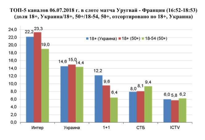 6 июля матч между сборными Уругвая и Франции по аудитории 18+ собрал долю 22,2% по всей Украине и 23,3% в крупных городах. По аудитории 18-54 в городах с населением больше 50 тыс. доля составила 19%.