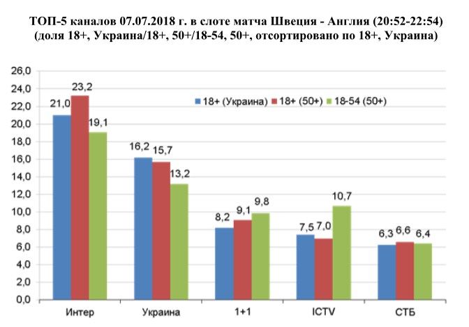 Еще один матч субботнего дня также лидировал в своем слоте. Поединок за выход в полуфинал между сборными Швеции и Англии собрал у экранов телевизоров 21% зрителей старше 18 лет в целом по Украине, в крупных городах – 23,3%. Доля по аудитории 18-54 в крупных городах составила 19,1%.