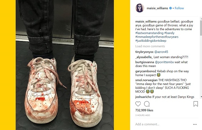 На днях о завершении съемок в сериале сообщила актриса Мейси Уильямс, которая играла Арью Старк. Девушка опубликовала фотографию "окровавленных" кроссовок и написала: "До свидания, Белфаст. До свидания, Арья. До свидания, "Игра престолов". Какая радость у меня была. Вот к чему привели мои приключения".