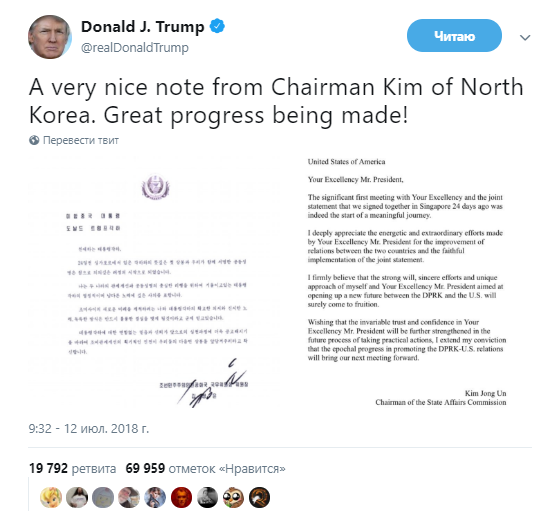 "Очень хорошее письмо от лидера Северной Кореи Кима. Достигнут большой прогресс", - написал глава Белого дома.