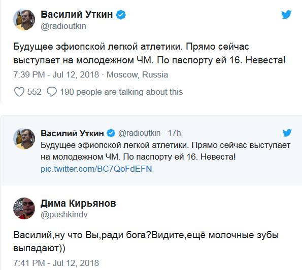 А между тем в официальном отчете Международной ассоциации легкоатлетических федераций (IAAF) указана дата рождении эфиопки: 21 ноября 2001 года, однако внешне атлетка выглядит гораздо старше заявленных 16 лет.