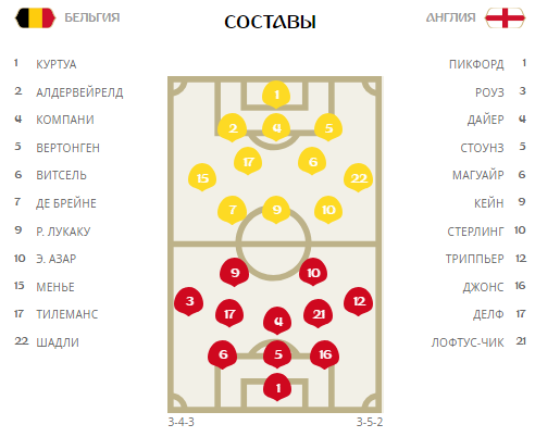 Бельгия: Куртуа -  защита Альдервейрельд, Компани, Вертонген - полузащита Менье, Витсель, Тилеманс, Шадли - нападение Де Брюйне, Лукаку, Э. Азар.
