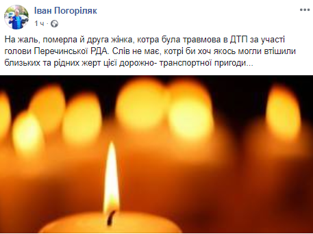 "К сожалению, скончалась и вторая женщина, которая была травмирована в ДТП при участии председателя Перечинской РГА. Слов нет, которые бы хоть как-то могли утешить близких и родных жертв данного дорожно-транспортного происшествия..." – написал он в воскресенье вечером.