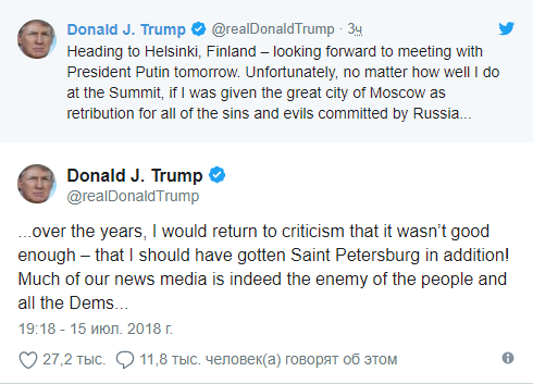 "Направляюсь в Хельсинки (Финляндию) жду с нетерпением встречи с президентом Путиным завтра. К сожалению, не имеет значения, насколько успешными станут переговоры, если даже мне отдадут Москву за все прегрешения и зло, которое совершила Россия... спустя годы я встречусь с критикой, что я не был достаточно хорош на саммите, потому что не получил еще и Санкт-Петербург в придачу!", – написал Трамп.