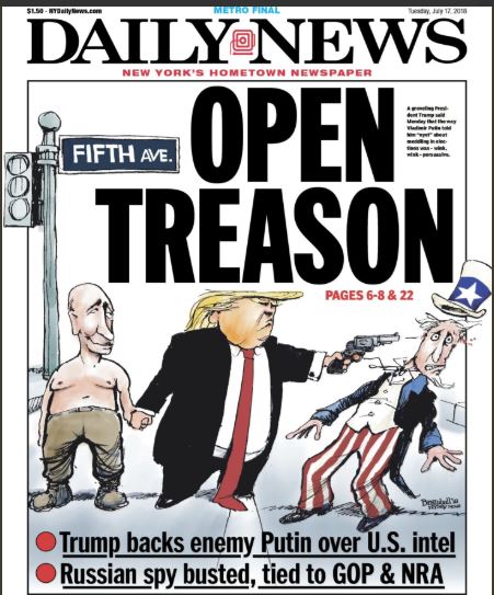 Газета The Washington Post, которое открыто занимает жесткую антитрамповскую позицию, на следующей день после саммита в Хельсинки опубликовало серию критических статей о действиях главы Белого дома, при этом редакционную статью об этой встрече издание озаглавило "Трамп только что вступил в сговор с Россией. Открыто".