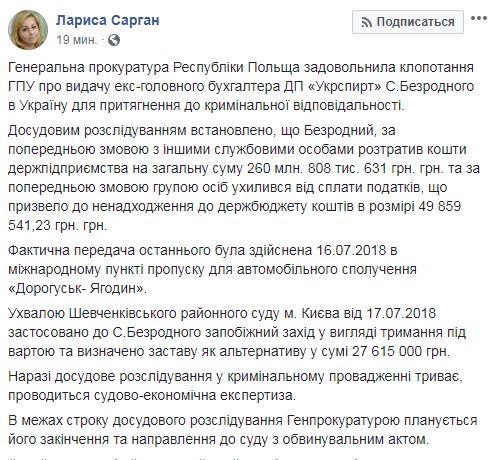 Польша выдала Украине главбуха "Укрспирта". Он может выйти под залог в 28 миллионов
