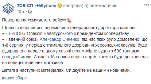 Первая баржа с херсонскими "арбузами от Гройсмана", которые стали одними из самых популярных мемов в прошлом году, будет отправлена в Киев с 1 по 8 августа, в период оптимального созревания ягоды. Об этом сообщает пресс-служба ТОВ СП "Нібулон" в Facebook.
