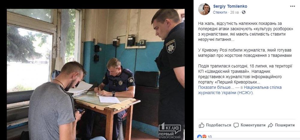 В Кривом Роге избили журналиста, который собирался написать материал о жестоком обращении с животными. Об этом инциденте сообщил в Facebook председатель Национального союза журналистов Украины Сергей Томиленко. Происшествие случилось сегодня, 18 июля, на территории КП "Скоростной трамвай".