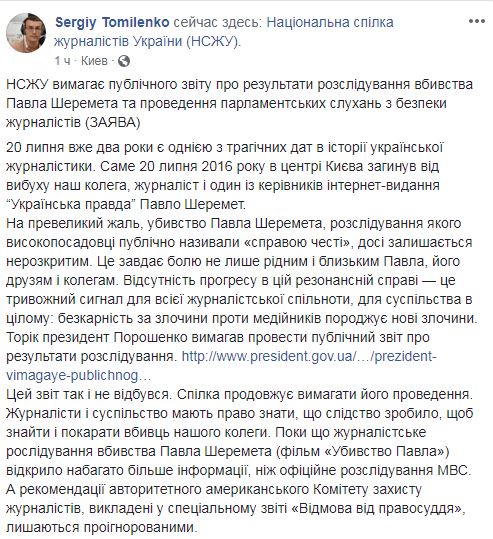 "НСЖУ требует скорейшего расследования убийства Павла Шеремета и публичного отчета следствия о его результатах и проведение осенью 2018 парламентских слушаний по вопросам свободы слова и безопасности работы журналистов в Украине", - отмечается в сообщении.