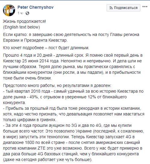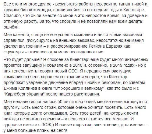 "Что будет дальше? Я спокоен за "Киевстар": еще будет много интересных проектов запущено и объявлено в 2018 году и, особенно, в 2019 - но о них теперь пусть говорит новый СЕО. Я передаю ему растущую компанию в очень хорошем состоянии, и уверен, что "Киевстар" продолжит уверенное движение вперед к новым рекордам, по заветам Джима Коллинза в книге "От хорошего к великому", как это было и с "Карлсберг Украина" после нашего расставания", - подчеркнул Чернышов.