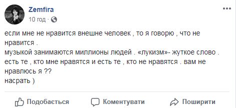 Чуть позже Земфира написала другой пост – уже после критики в лукизме (зацикленности на внешности – прим. ред). В нем она сообщила, что если ей не нравится внешне человек, "то она говорит, что не нравится": "Музыкой занимаются миллионы людей . "Лукизм" - жуткое слово. есть те, кто мне нравятся и есть те, кто не нравятся. Вам не нравлюсь я?? Насрать".