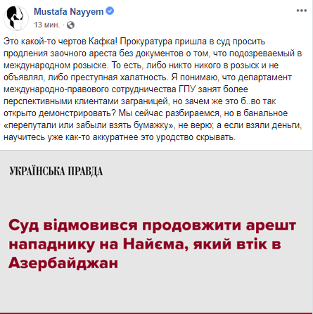 "Это какой-то чертов Кафка! Прокуратура пришла в суд просить продления заочного ареста без документов о том, что подозреваемый в международном розыске. То есть, либо никто никого в розыск и не объявлял, либо преступная халатность. Я понимаю, что департамент международно-правового сотрудничества ГПУ занят более перспективными клиентами заграницей, но зачем же это б..во так открыто демонстрировать? Мы сейчас разбираемся, но в банальное "перепутали или забыли взять бумажку", не верю; а если взяли деньги, научитесь уже как-то аккуратнее это уродство скрывать", - отметил Найем.