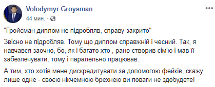 Сам же Гройсман заявил, что не подделывал свой диплом о высшем образовании,а попытки дискредитировать его с помощью фейков ни к чему не приведут.